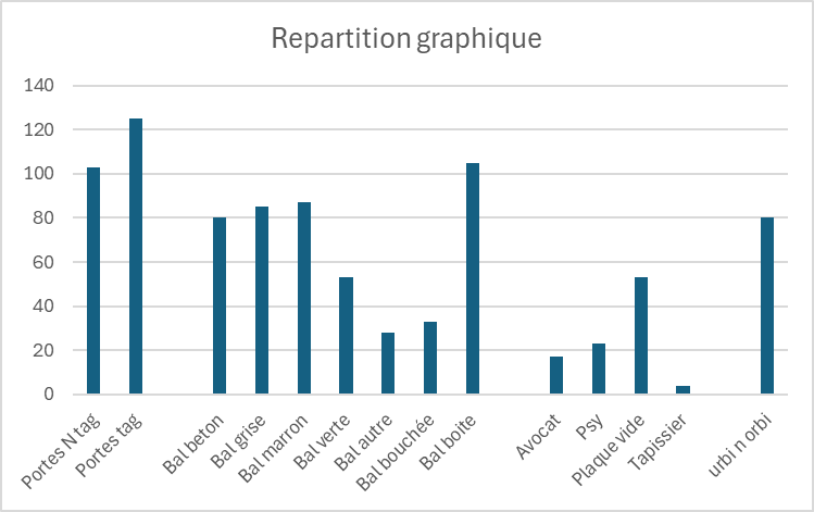 Parti sur cette base-là pour collecter la variation, au bout d’un certain temps, il y a eu tout de même quelques portes qui avaient attiré notre attention et face à la diversité et la morphologie des boites aux lettres (bal) susceptibles à ne pas recevoir de la publicité, on a laissé « la phrase » de côté pour s’orienter vers bal et portes.